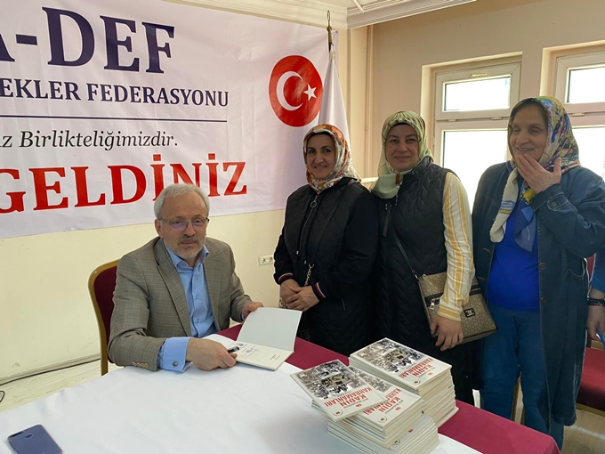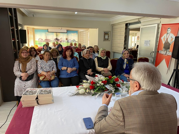 Seven 'Milli Mücadelenin Kahraman Türk Kadınları' isimli kitabını imzalayarak konferansı tertipleyen Kadın Kolları Başkanı Mübeccel taş'a ve konferansa katılanlara teşekkür etti.