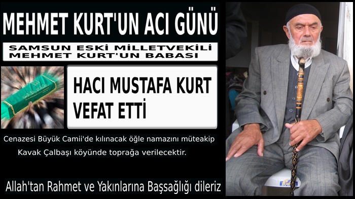 AK Parti 22. Dönem Samsun Milletvekili ve Samsun 3. Noteri Mehmet Kurt'un Babası Hacı Mustafa Kurt (91) Samsun'da vefat etti. Hacı Mustafa Kurt bir süredir sağlık sorunları yaşamakta ve tedavi görmekteydi. Çevresi tarafından sevilen ve sayılan bir kişiliğe sahip olan Hacı Mustafa Kurt'un sevenleri ve yakınları vefat haberiyle büyük üzüntü yaşadı.