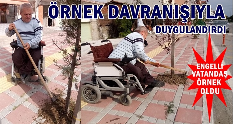 Engelli arabası ve elinde kazmasıyla ağaç fidanlarının toprağını tazeleyen Süleyman Kalaycı bu davranışıyla görenlerin hem duygulanıp hem de heyecanlanmasına yol açtığı görülüyor.