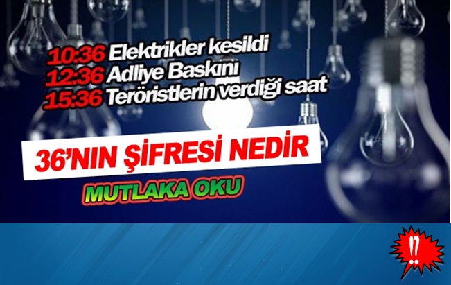 Türkiye'de 45 şehir saat 10:36'da karanlıkta kaldı! Saatler 12:36'yı gösterirken şehit savcımız Kiraz rehin alındı! Teröristler saat 15:36'ya kadar süre tanıdı! Yukarıda yazdım! Bu adamlar en ince ayrıntıya kadar düşünüp oyun kurardı! Türkiye'ye de önceki gün böyle bir akılla gelip saatlerin sonundaki 36'yı görmemizi istediler!
