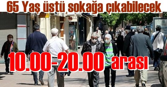 Tüm dünyayı etkisi altına alan ve 11 Mart'ta Türkiye'de görülen yeni tip koronavirüs salgınında risk grubunda bulunan 65 yaş üstü vatandaşlar için müjdeli HABER geldi. 65 yaş üstü vatandaşlar, haftanın her günü saat 10.00 ila 20.00 arasında dışarı çıkabilecek.