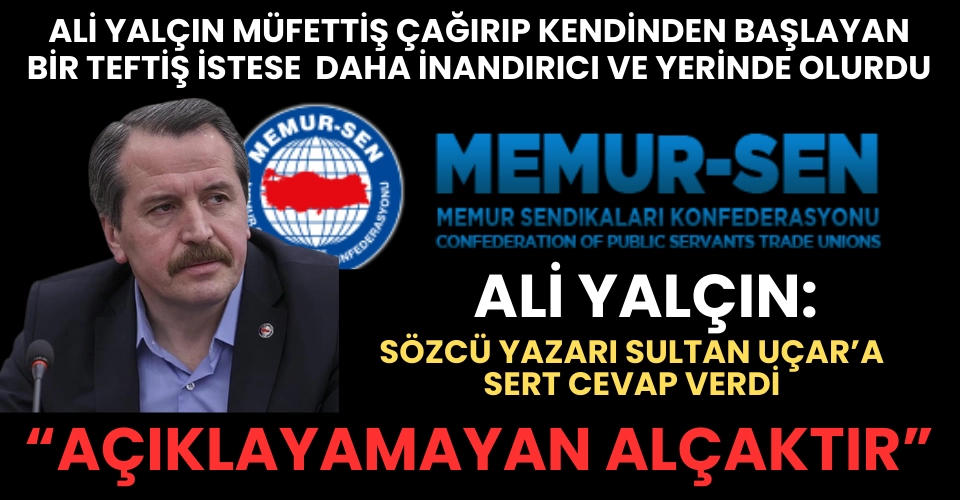 Memur Sen Genel Başkanı Ali Yalçın, Gazeteciler günüde 500 bin lira maaş aldığını iddia eden ve bu iddiasını ismini gizlediği bir kişiye dayandırdığını belirten Sözcü yazarı Sultan Uçar'a sert cevap verdi. Memur Sen Genel Başkanı Ali Yalçın yaptığı açıklamada "Çalışan Gazeteciler Gününde çamur atanların niyetini biliyoruz. Sözcü yazarı Sultan Uçar, asılsız haberinde bilgi aldığını ve ismini sakladığını iddia ettiği kişiyi ve belgeleri kamuoyuna açıklamaz ise o da o kişi kadar alçaktır." dedi.