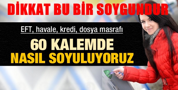 Kapısından giren müşterinin her adımını paraya döken bankalar, vatandaşa EFT, havale, kredi dosya masrafı gibi işlemleri için 'astronomik' tarifeler uygularken; herhangi bir işlem yapılmayan hesaptan bile 'işlemsizlik' ücreti alıyor. Bankaların vatandaştan aldığı 60 kalem ücretin detayları açıklandı. Listede yok yok... Buna göre bankalar; hesap açmaktan hesap defteri yazdırmaya kadar her işlemden hatta olmayan işlemden bile ücret tahsil ediyor. Herhangi bir işlem yapılmayan hesaptan 1-8 lira arasında işlemsizlik ücreti isteniyor. Kiralık kasadan 150 lira ila bin lira arasında ücret alındığı yetmiyormuş gibi, kiralanan kasayı ziyaret de ücrete tabi. Bunun için 5-35 lira arasında para alınıyor.