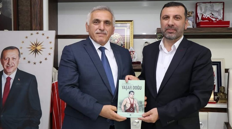 Kavak Belediye Başkanı İbrahim Sarıcaoğlu ziyaret anısına Türk Güreşinin Sembolü Dünya ve Olimpiyat Şampiyonu Yaşar Doğu'nun kitabını hediye etti.