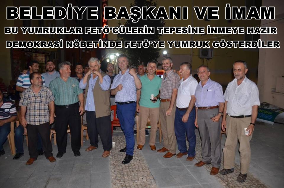 19 Mayıs Belediye Başkanı Osman Topaloğlu ve Yeşilköy Mahallesi Camii İmam-Hatibi Sadık Keskin yan yana gelerek ; 'Ülke birliğine el uzatan FETÖ'cüler her zaman karşılarından bizi bulacaklardır. Bu yumruklar hainlerin tepesine inmek için her zaman hazır beklemektedir. Bizim için nöbet bitmemiştir. Ne zaman tehlike görsek imanımızla uçar, yumruğumuzla ezeriz'diyerek objektiflere yumruklu poz verdiler.