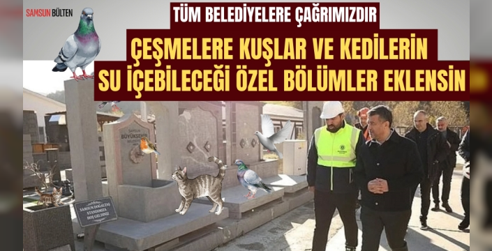 "Samsun Büyükşehir Belediyesine, çeşmelere kedi ve kuşların da su içebileceği özel bölümler eklenmesi çağrısında bulunuyoruz. Mezartaşlarına su kabı koyuyoruz ancak mahalle veya caddelerde yapılan çeşmelerde bu eksiklikle karşılaşıyoruz. Yapılan veya mevcut hizmet veren çeşmelerde kuş ve kedilerin de su içebilmelerine imkan tanıyan bölümlerin yapılması uygun olacaktır. Bu talebimizin yerine getirilmesini teklif ediyoruz."