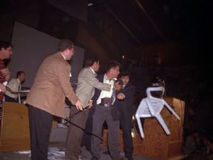 MHP, Alparslan Türkeş'in ölümünün ardından yeni genel başkanını seçmek için toplanmıştı. Adaylardan Ramiz Ongun, Enis Öksüz, Muharrem Şemsek ve İbrahim Çifçi ilk tur oylama sonucundan sonra Devlet Bahçeli lehine adaylıktan çekildiler. Bunun üzerine Tuğrul Türkeş'i destekleyen Ülkü Ocakları Eski Başkanı Azmi Karamahmutoğlu arkadaşlarıyla kürsüye geldi. "Ya çekiç olacaksınız ya örs, aradaki demir olmayacaksınız" diyerek lafa başladı, "Bu pazarlıklı kongreyi tanımıyoruz" diye devam etti, "Eğer illegaliteye kaymak gerekiyorsa bunu fert olarak başlatıyorum. İsteyen benimle birlikte gelir katılır" diye bitirdi. İnmeden önce yanındakiler "Yıkın kürsüyü" talimatı vermeyi de ihmal etmedi. Kürsü yıkıldı; masalar, sandalyeler, demirler havada uçuştu. Hatta araya havaya açılan sekiz el silah sesi de karıştı. Kongre ertelendi?