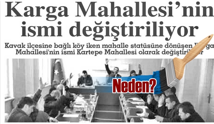 Önceki gün Kavak Belediye Meclisi bir müracaatı konuşup tartıştı. Dosyalar ilgili makama gönderildi. Kavak İlçe sınırımızda bulunan ve şirin bir köy olan Karga köyünün ismin de değişikliğe gidilmesiydi? Karga köyü sakinleri muhtemelen bu isimden rahatsız olmuşlardı. Yüzlerce yıllık bir isim 'Kartepe' olarak değişecekti. Dikkatler hep o kuşun üzerine çekildi: Karga. Köyün Muhtarı bu ismin nereden geldiğini nasıl verildiğini bilmiyorum diyor. Doğrudur. Araştırmazsanız arkadaşınızın ismini bile bilemezsiniz.