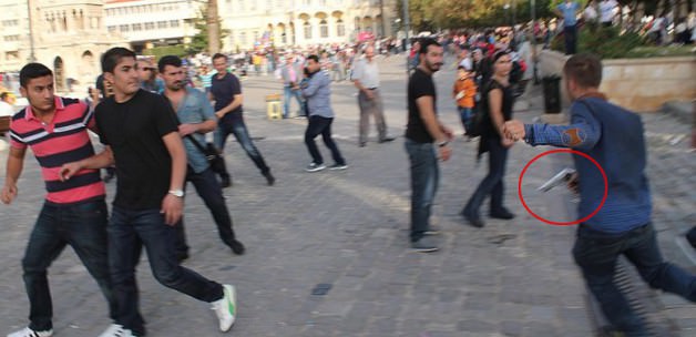 Ardından dağılmaya başlayan topluluktan bazıları Valilik hizmet binası yakınlarında slogan atmaya başladı. Bu sırada polisle göstericiler arasında gerginlik çıktı. Gözaltına alınmak istenen bir kişi koşarak kaçmaya başlayınca, kovalamaca yaşandı. Konak Vapur İskelesi yakınlarında cebinden çıkarttığı bıçağı ensesine dayayan eylemci, polise teslim olmamak için bir süre direndi. Eylemciyi etkisiz hale getirmeye çalışan polislerin arkasından yaklaşan bir başka kişi, bir polisin tabancasını alıp koşmaya başladı. İzmir Saat Kulesi önünde diğer polisler tarafından durdurulan bu kişi etkisiz hale getirilip elindeki tabanca alındı. Bazı eylemcilerle polis arasında arbede yaşandı. Arbede sırasında bazı göstericiler gözaltına alındı. Yaşananların ardından dağılmak istemeyen grup, eyleme destek veren siyasi parti temsilcilerinin araya girmesiyle alanı terk etti.