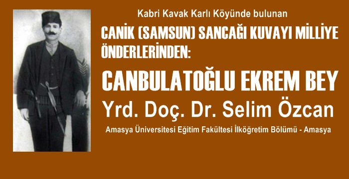 Çalışmamızda; mütareke sonrası Canik Sancağı'nın durumunun kısa bir değerlendirmesini yaptıktan sonra Ekrem Bey'in öz geçmişini ve bölgesinde yaptığı faaliyetlerini ortaya koymaya çalışacağız. Canbulatoğlu Ekrem Bey'in Biyografisi Kafkas Vubıh kökenli kuvayı milliye önderi Canbulatoğlu Ekrem Bey, 1864 Büyük Kafkas Çerkez sürgününde Vubıh (Bugünkü Soçi) bölgesinden sürülerek Samsun'a gelen ve Kavak nahiyesine bağlı Karlı köyünü kurarak yerle- şen Vubıhların Kamlat Berzeg soyundan gelen bir ailenin çocuğudur. H.1303 (1887) yılında Karlı köyünde doğdu. Canbulat Bey'in oğludur. Annesi Kafkasya doğumlu Zabıthan'dır. Mütareke Dönemi'nde Samsun-Amasya-Tokat bölgesindeki Müslüman köylerine saldırıda bulunan siyasi ve yağmacı Rum-Pontus çetelerine karşı verdiği mücadele ile tanındı. Türk halkının takdirini kazandı. Kavak nahiyesindeki Kafkas-Çerkez köylerindeki gençlerden oluşturduğu 200 kişilik süvari birliğiyle, dönemin Samsun Mutasarrıfının da desteğini alarak Rum-Pontus çetelerine, Samsun ve Merzifon'a geçen İngilizlere karşı mücadelelerde bulundu.