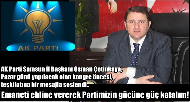 AK Parti Samsun Teşkilatı'nın geleceğe yürüyüşüne yeni bir heyecan ve coşkuyla, artan bir güçle devam edeceğini de kaydeden Çetinkaya, ''Amacımız Samsun’dan yükselecek güç ile AK Parti'nin 2023 hedefine giden yolunu açmak, gücüne güç katmaktır. Bu hedefe doğru değerli teşkilatımızın katkılarıyla emin adımlarla ilerliyoruz.. AK Parti Samsun 4. Olağan İl Kongresi'nin Samsunumuza hayırlı olmasını diliyorum” dedi.