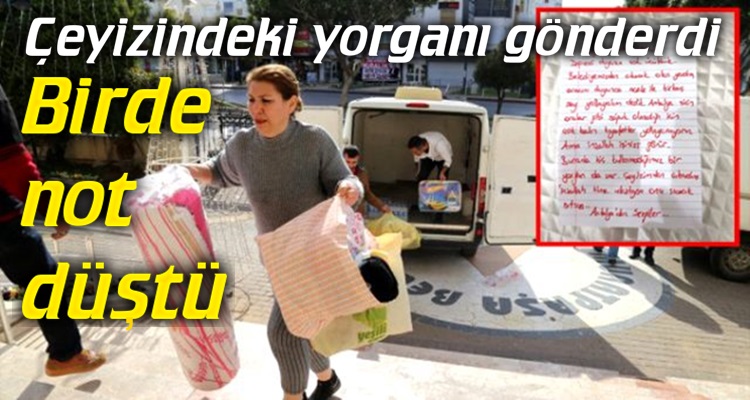 Belediye görevlileri ve gönüllülerce oluşturulan yardım kolilerinin arasında bulunan ve üzerinde, "Sevgili kardeşlerimiz, depremi duyunca çok üzüldük. Belediyemizden çıkacak olan yardım aracını duyunca aceleyle birkaç şey yollayalım, dedik. Antalya sizin oralar gibi soğuk olmadığı için çok kalın kıyafetler yollayamıyoruz. Ama inşallah işinizi görür. Burada hiç kullanmadığımız bir yorgan da var. Çeyizimden çıkardım. İnşallah kime ulaştıysa onu sıcacık ısıtsın. Antalya'dan sevgiler." yazılı not kağıdı, okuyanları duygulandırdı.
