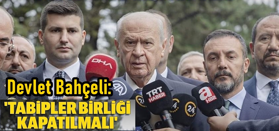 MHP lideri Bahçeli, "Siyasete alet olmuş kuruluşlarla bir yere varmak mümkün değildir. Tabipler Birliği kapatılmalıdır. Hekim kardeşlerim kendi kuruluşlarını yeniden sahiplenmeli yeni bir organizasyona gitmelidir. Bir avuç doktor kılıklı anarşik insanlardan mesleği kurtarmak lazım. Türk ismini taşıyan Türk’e düşman olur mu?" dedi.