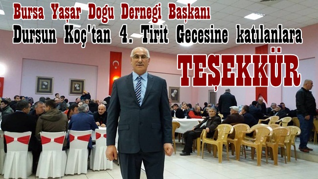 Bursa Yaşar Doğu Derneği Başkanı Dursun Koç bu yıl 4. sünü düzenledikleri Tirit Gecesine katılanlara Teşekkür etti.
