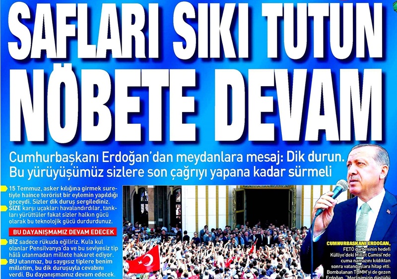 "Askeri elbiselerini giymek suretiyle terörist eylemin olduğu geceydi. Bir hafta geçti. Sizler millet olarak bir duruş sergilediniz. Sizlere bir çağrı yaptım, meydana yürüyelim dedim. Meydana yürüdünüz. Size karşı uçakları havalandırdılar, tankları yürüttüler fakat sizler halkın gücü olarak bütün bu teknolojik imkanları durdurunuz. Onlar paslı yüreklerle yürüdüler, sizler imanlı yüreklerinizle onları durdurdunuz ve geri püskürttünüz. Bu yürüyüşünüz, sizlere son duyuruyu yapana kadar devam edeceksiniz.