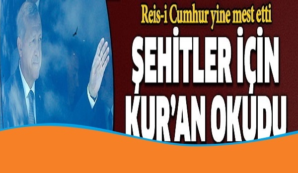 Gaziantepte Nurettin-Besna Akdoğan'ın çiftinin kına gecesinde bombalı saldırının düzenlendiği Gaziantepte programına devam eden Cumhurbaşkanı Recep Tayyip Erdoğan, eşi Emine Erdoğan, Diyanet İşleri Başkanı Mehmet Görmez, İstanbul Büyükşehir Belediye Başkanı Kadir Topbaş ve bazı bakanlar ile birlikte gittiği Ulucami'de Şehitler için Kur'an okudu.