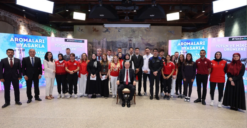 Cumhurbaşkanı Recep Tayyip Erdoğan, Tütün Ürünlerinin Zararlarının Önlenmesi Kanunu'nun yıl dönümünde Dolmabahçe Çalışma Ofisi’nde gençlerle ve sporcularla buluştu.