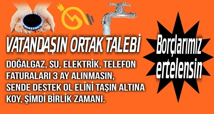 Düşüncelerini sosyal medyada dile getiren vatandaşlar süreç içerisinde ev ve işyerlerine ait doğalgaz, elektrik, su ve telefon faturalarının 3 ay sonrasına ertelenmesi için seslerinin ilgililer tarafından duyulup taleplerine olumlu karşılık verilmesini istiyorlar.