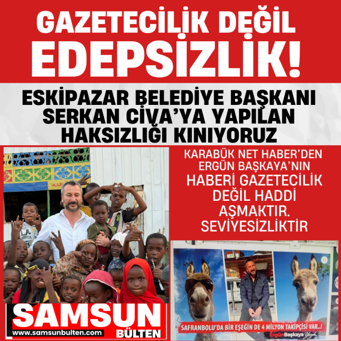 Geçtiğimiz günlerde Karabük Net Haber sitesinde Ergün Başkaya imzasıyla yayınlanan, Eskipazar Belediye Başkanı Serkan Civa’yı hedef alan o talihsiz yazı, basın tarihine bir "utanç vesikası" olarak geçmiştir. Bir tarafa bir eşek fotoğrafı, diğer tarafa ise halkın iradesiyle seçilmiş bir Belediye Başkanı’nın fotoğrafını koyarak; "Safranbolu’da bir eşeğin de 4 milyon takipçisi var" başlığı atmak, eleştiri değil, düpedüz bir karakter aşımıdır.