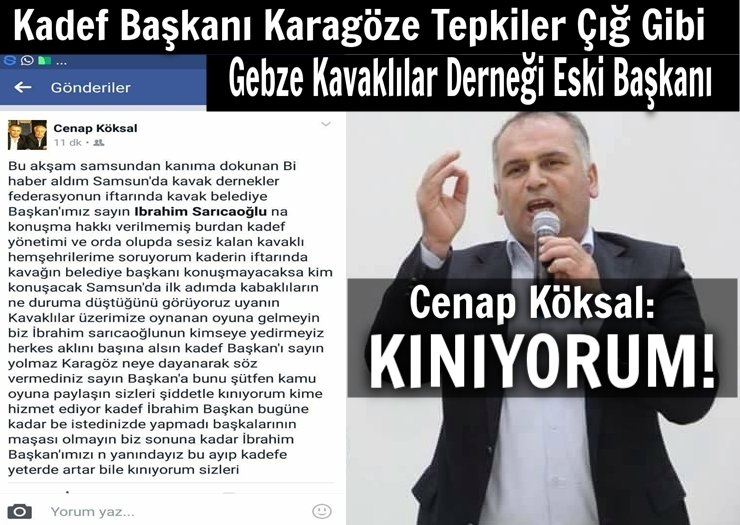 Kavak Dernekler Federasyonu'nun (KADEF) İlkadım Derebahçe Sosyal Tesislerinde gerçekleştirdiği iftar yemeğindİ Kavak Belediye Başkanı İbrahim Sarıcaoğluna söz verilmemesine bir tepkide Gebze Kavaklılar Derneği Eski Başkanı Cenap Köksal'dan geldi.