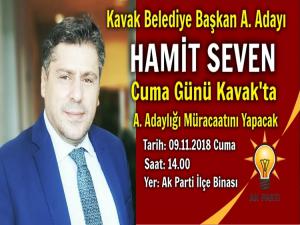 Doğup büyüdüğü Kavakta belediye başkanlığına talip olduğunu dile getiren Hamit Seven, uzun süredir AK Parti Genel Merkezinde görevli olduğunu ve kazanmış olduğu tecrübelerini belediyecilik alanında memleketi Kavaka taşıyarak Kavakı daha müreffeh bir seviyeye getirmek için gece gündüz çalışacağını sözlerine ekledi.