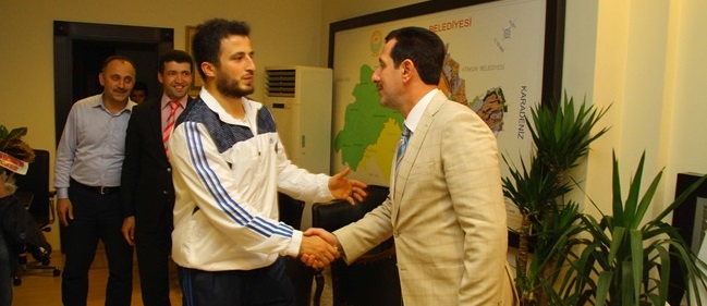Türkiye 3.'sü olan Yakup Güle İlkadım Belediye Başkanı Erdoğan Tok'a kispet hediye etti.