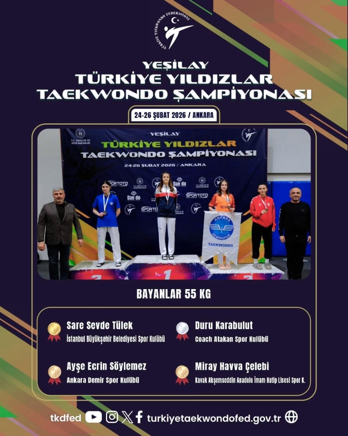 ANKARA – 24-26 Şubat 2026 tarihlerinde Ankara Taha Akgül Spor Salonu’nda düzenlenen Yeşilay Yıldızlar Türkiye Taekwondo Şampiyonası’nda Samsun rüzgarı esti. Kavak İlçe Gençlik ve Spor Müdürlüğü bünyesinde yetişen, Kavak Çakallı Ortaokulu öğrencisi Miray Havva Çelebi, 55 kg kategorisinde Türkiye 3.’sü olarak büyük bir başarıya imza attı.