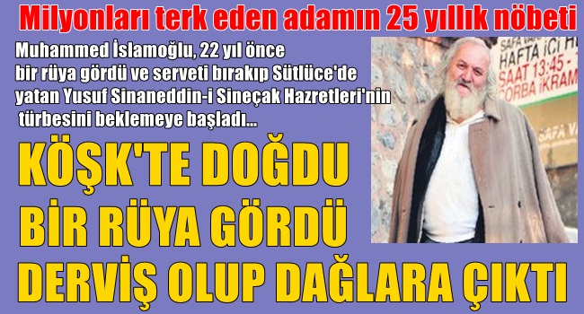 Hüber Köşkü'ne doğdu. Babası fabrikatördü. Muhammed İslamoğlu, 22 yıl önce bir rüya gördü ve serveti bırakıp Sütlüce'de yatan Yusuf Sinaneddin-i Sineçak Hazretleri'nin türbesini beklemeye başladı...