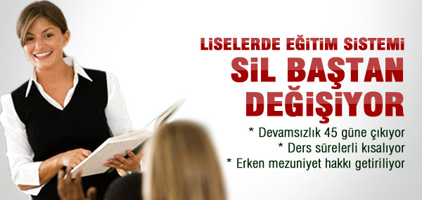 Hazırlanan taslağa göre; 10. sınıf sonunda bütün derslerden başarılı olup yılsonu başarı puanı en az 90 ve üzeri olan 11. sınıf öğrencileri erken mezuniyet hakkına sahip olacak Halen 20 gün olan “özürsüz” devamsızlık süresi 45 güne çıkacak. Sorumlu olarak sınıf geçmede ders sayısı ise 5’ten 6’ya yükseltilecek. Ders süreleri 45’ten 40 dakikaya inecek.