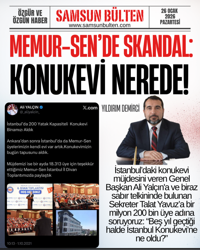 İstanbul’daki konukevi müjdesini veren Genel Başkan Ali Yalçın'a ve biraz sabır telkininde bulunan Sekreter Talat Yavuz’a bir milyon 200 bin üye adına soruyoruz: “Beş yıl geçtiği halde İstanbul Konukevi’ne ne oldu?”