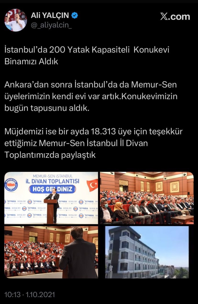 30 Eylül 2021 tarihinde Memur-Sen İstanbul İl Divan Toplantısı’nda kürsüye çıkan Genel Başkan Ali Yalçın, İstanbul Haliç’te merkezi konumda 200 yatak kapasiteli “EBS Konukevi” binasının tapusunun alındığını ve çok yakında hizmete açılacağını ilan etmişti. Salonda yaptığı bu açıklamayı bir gün sonra da sosyal medya üzerinden kamuoyuna duyurmuştu. Sendika sekreteri Talat Yavuz ise 04.10.2021 tarihinde sosyal medya hesabından yaptığı paylaşımda, “biraz daha sabır” istemişti.