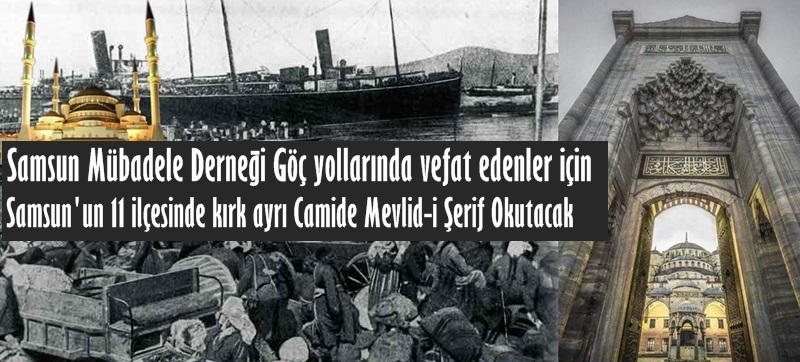 Samsun Mübadele Derneği Başkanı Salih Meriç yaptığı açıklamada Mübadele ve göç yollarında vefat eden insanlarımız için bu yılda Samsunun 11 ayrı ilçesinde 40 ayrı Camide Mevlid-i Şerif okutabilmek için çalışmalara başladık dedi.