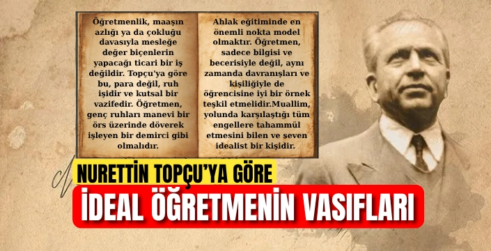 Türk düşünce ve eğitim hayatının önemli isimlerinden Nurettin Topçu, öğretmenlik mesleğine (muallimliğe) kutsal bir vazife olarak bakar ve bu mesleği sıradan bir iş olarak görmez. Ona göre öğretmen, sadece ders anlatan ya da bilgi aktaran bir "nakilci" değil, öğrencisinin ruhunu biçimlendiren, ona karakter ve şahsiyet kazandıran bir sanatkârdır. Topçu'nun eserlerinde öne çıkan ideal öğretmen profili, yüksek manevi ve ahlaki sorumluluklarla donatılmış, aksiyon adamı bir rehberdir.