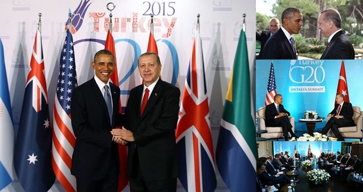 G-20 Zirvesi'nde iklim değişikliği, mülteci meselesi, dünyadaki finansal ve ekonomik gelişmelerin değerlendirileceğini kaydeden Cumhurbaşkanı Erdoğan, Başkan Obama ile yaptıkları görüşmede Suriye'de yürütülen DAEŞ ile mücadeleyi, Koalisyon Güçleri noktasında bundan sonra atacakları adımları değerlendirme ele alma fırsatı bulduklarını açıkladı. Cumhurbaşkanı Erdoğan, Türkiye ile ABD'nin model ve stratejik ortaklar olarak bundan sonraki süreçte de dayanışmalarını dünya barışına katkıda bulunmak için kararlılıkla devam ettireceklerini de sözlerine ekledi.