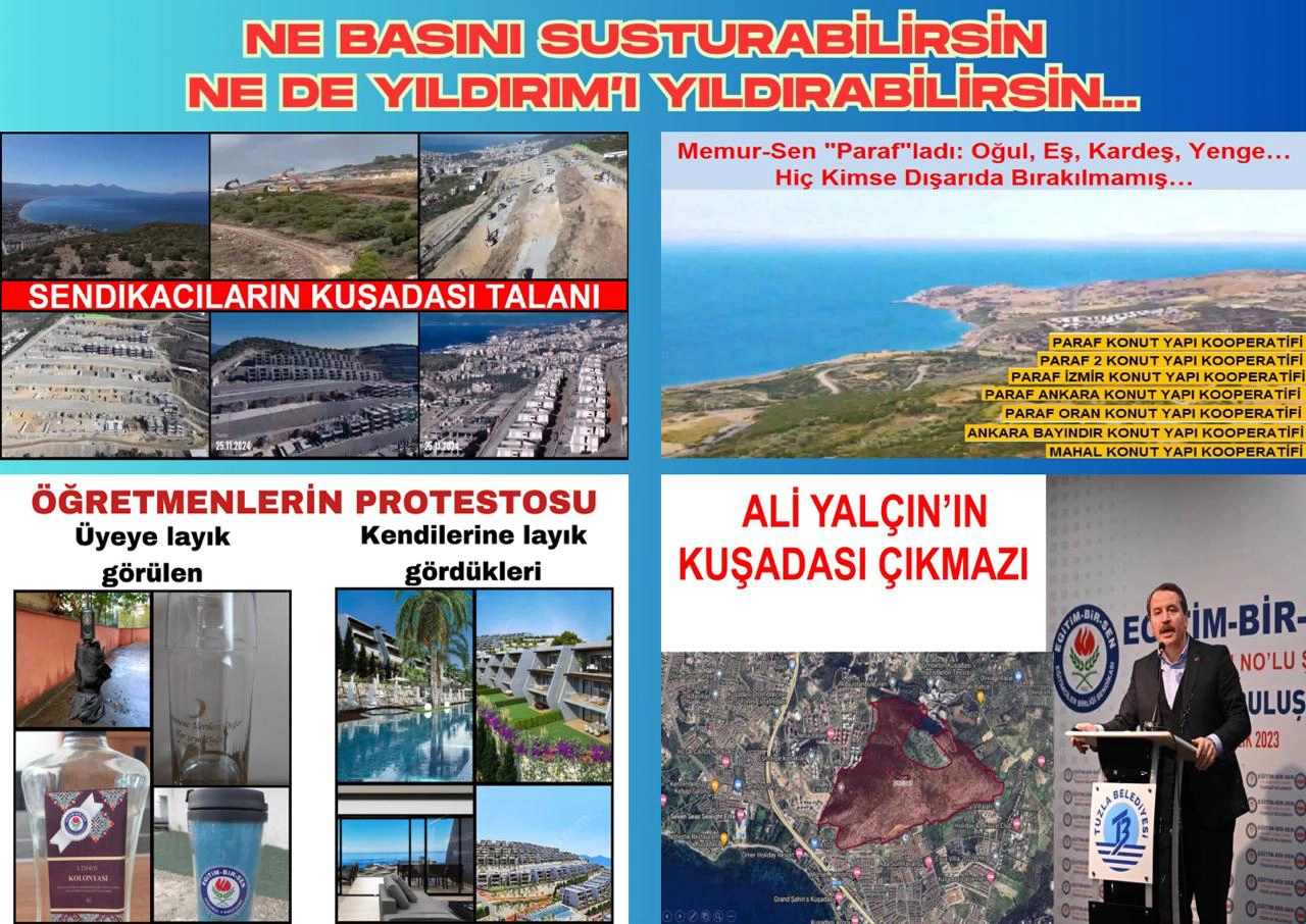 Bazı haber ajansları 24.09.2023 tarihli sürmanşetlerinde: “Memur-Sen’den Kuşadası’nda Cennet Gibi Konutlar” başlıklı haberle vicdanları derinden yaralayan sendikacıların Kuşadası talanını kamuoyuna duyurdu. Kuşadası’nın zirvesindeki TOKİ arazisine amacı dışında bir emek örgütü tarafından yaptırılan muhteşem deniz manzaralı ultra lüks villalar ne hukukidir ne ahlakidir ne insanidir ne de İslamidir. Sendikanın örgütsel gücüyle ve kurdukları yedi ayrı yapı kooperatif marifetiyle rantta sınır tanımayan sendikaya çöreklenmiş bir avuç şebeke, bu haberler karşısında: “Buranın bizimle alakası yoktur.” algısı oluşturarak bu rant işinden kendilerini sıyırmaya çalıştılar.