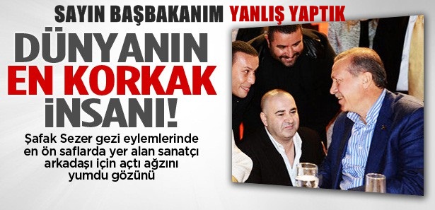 'Gezi Parkı eylemine katılmadım' diyen Şafak Sezer, Başbakan Erdoğan için de '15 yıl daha Erdoğan gibi bir lider gelmez' dedi. Oyuncu Mehmet Ali Alabora'nın 'dünyanın en korkak adamı' olduğunu söyleyen Sezer, "Ak Parti'ye 2 kez oy verdim." dedi.