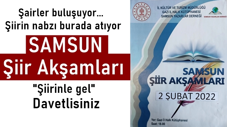 Şiir severlerin ilgi odağı haline gelen Samsun Şiir Akşamları bu ay 02 Şubat 2022 Çarşamba günü saat 18.00'de Samsun Gazi İl Halk Kütüphanesi salonunda gerçekleşecek.