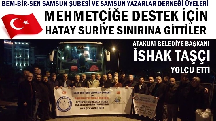 Burada kısa bir konuşma yapan BEM BİR SEN Samsun Şube Başkanı Nurettin Sever ; " Afrinde teröristlerle mücadele veren askerlerimize destek amacıyla Hatay-hassa Suriye sınırına hareket ediyoruz. Millet olarak birlik ve beraberliğimizi hissettirmek istiyoruz. Bu anlamda bizlere araç tahsisinde bulunan Atakum Belediye Başkanı Sn. İshak Taşçıya çok teşekkür ediyorum. Bizimle birlikte gönderdikleri selamlarını Mehmetçiğimize ileteceğiz. Bu ziyarete katılan arkadaşlarımıza da ayrı ayrı teşekkür ediyorum" dedi.