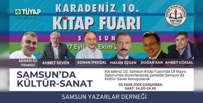 Samsun Yazarlar Derneği tarafından organize edilen panel, 1 Ekim 2025 Çarşamba günü saat 15.00-15.45 arasında 19 Mayıs Salonu'nda gerçekleşecek. Moderatörlüğünü Adnan Öz'ün üstlendiği etkinlikte, Samsun'un önde gelen isimleri konuşmacı olarak yer alacak.