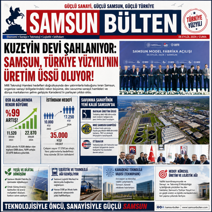 #Samsun #SanayiVeTeknoloji #MilliTeknolojiHamlesi #TürkiyeYüzyılı #Üretim #İstihdam #BAYKAR #MKE #YeşilSanayi #Teknoloji #SamsunBülten #KaradenizEkonomisi