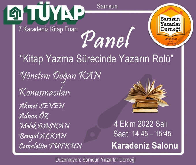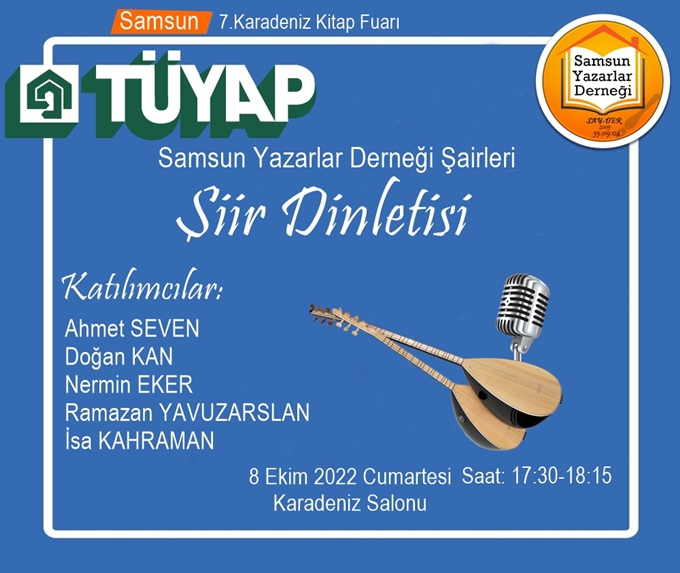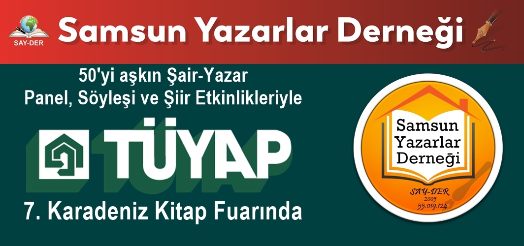 Samsun Yazarlar Derneği 01-09 Ekim 2022 Tarihleri arasında Samsunda açılacak olan TÜYAP 7. Karadeniz Kitap Fuarına 50’ yi aşkın şair ve yazarla katılıyor.