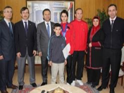 Vali Hüseyin Aksoy, genç sporcuyu tebrik ederek altınla ödüllendirdi.