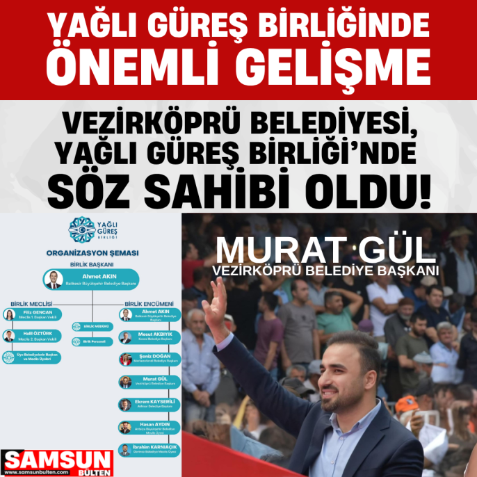 Son yıllarda gerçekleştirdiği dev organizasyonlarla kültürel ve sportif alanda büyük bir ivme yakalayan Vezirköprü Belediyesi, Türkiye genelinde adından söz ettirmeye devam ediyor. İlçenin başarıları, ulusal ölçekteki birliklerde de karşılık buldu. Vezirköprü Belediye Başkanı Av. Murat Gül, Yağlı Güreş Birliği bünyesinde encümen üyeliğine seçilerek kritik bir komisyonda görev almaya hak kazandı.