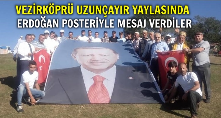 Vezirköprü Esenköy Uzunçayır yayla festivalinde Festival Tertip Komitesi Başkanı Yerel Yönetimler Danışmanı Yakup İba ve Arş. Yazar Ahmet Seven açtıkları dev Recep Tayyip Erdoğan posteriyle Emperyalizmin dayatmasına, hainlerin saldırısına karşı devletimizin yanındayız mesajı verdiler. Açılan dev posterin etrafında yer alan vatandaşlar da her türlü dayatma ve baskıya karşı devletimize desteğimiz tamdır dediler.