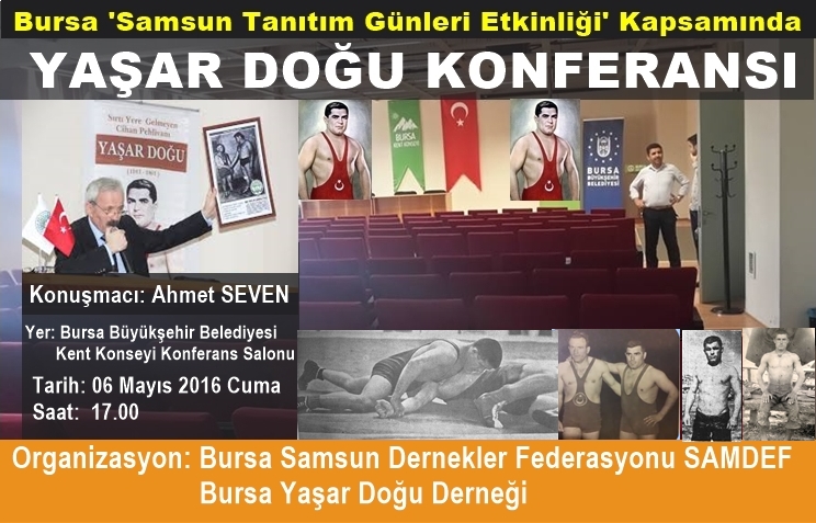 Samsun Tanıtım Günleri etkinliği kapsamında bu yıl 6 Mayıs 2016 Cuma günü Saat 17.00' de Bursa Büyükşehir Kent Konseyi Salonunda Samsun Yazarlar Derneği Başkanı Arş. Yazar Ahmet Seven tarafından 'Yaşar Doğu' konulu bir konferans verilecek.