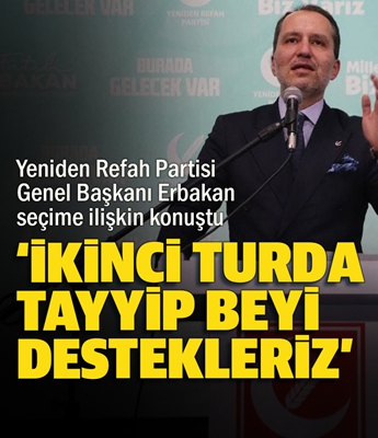 Yeniden Refah Partisi Genel Başkanı Fatih Erbakan, seçime ilişkin yaptığı açıklamada ikinci tura Kemal Kılıçdaroğlu ve Cumhurbaşkanı Erdoğan'ın kalması durumunda Erdoğan'ı destekleyeceklerini belirtti.
