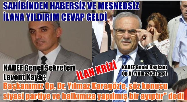 "Samsun'da yayınlanan yerel bir gazetede KADEF Genel Başkanı Op.Dr. Yılmaz Karagöz adına bir ilan yayınlandığını ve ilanda halkın Kurban Bayramını kutlayan Op. Dr. Yılmaz Karagöz'ün, CHP'den aday adayı olarak gösterildiğini belirten KADEF Genel Sekreteri Levent Kaya, "Başkanımızın bilgisi dışında, kimin veya kimlerin verdiği bilinmeyen ilanın iyi niyetten uzak tamamen spekülasyon amaçlı olduğunu düşünmekteyiz. Hiçbir partiden aday adaylığını açıklamayan Başkanımızı bir partinin aday adayı olarak göstermek, Başkanımız Op. Dr. Yılmaz Karagöz'e, söz konusu siyasi partiye ve halkımıza yapılmış bir ayıptır" dedi.