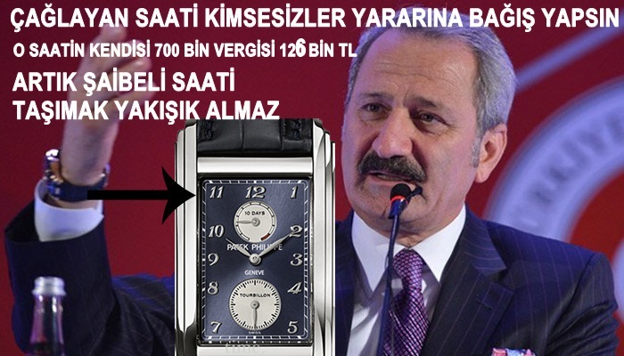 Türkiye bu kadar işlerinin arasında 700 bin Tl.lik saati konuşuyor. Araştırmalar sonucu gerçek ortaya çıkacak. Ancak şu var ki saat şaibeli. Memur maaşlarının bile yoksulluk sınırının altında kaldığı Türkiyede ederiyle akıllara durgunluk veren saat tartışması sona ermeli. Eski Bakan Zafer çağlayan o saati kimsesizler yurdu yararına bağış yapmalıdır. Şaibeli bir saati taşıyarak vatandaşı ve mensubu bulunduğu hükumeti zorda bırakmamalıdır.